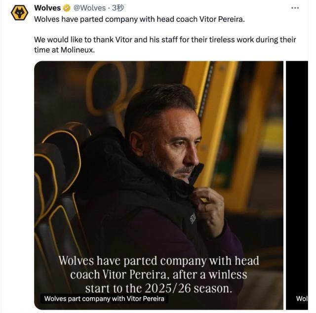 狼隊官宣主帥佩雷拉下課:“狼隊與主教練維托爾·佩雷拉分道揚鑣。我們要感謝維托和他的團隊在莫利紐球場(chǎng)工作期間的辛勤付出?!毙沦惣厩?0輪,狼隊2平8負一場(chǎng)不勝排名墊底,在本輪0比3輸給富勒姆后,俱樂(lè )部決定解除佩雷拉主帥職務(wù)。去年12月佩雷拉上任救火,各項賽事帶隊38場(chǎng),14勝6平18負,勝率36.84%。佩雷拉是門(mén)德斯經(jīng)紀公司旗下教練,今年9月,他剛與狼隊續約到2028年,不過(guò)據悉其合同中有特殊條款,使得狼隊無(wú)需賠償合同內的全額薪水。